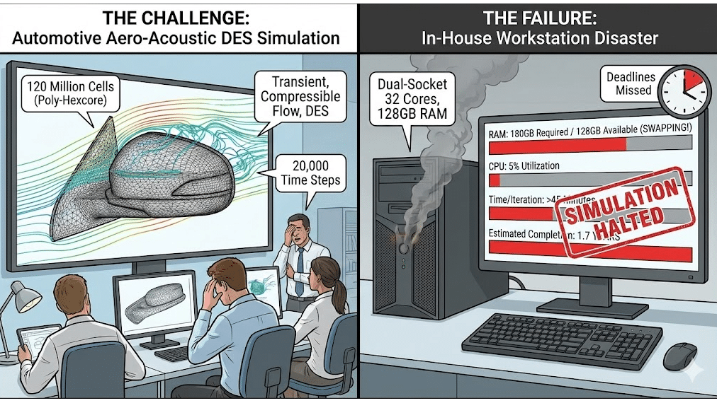 They attempted to run this large-scale aerodynamic simulation on their in-house “high-end” workstation—a dual-socket machine with 32 cores and 128GB of RAM.