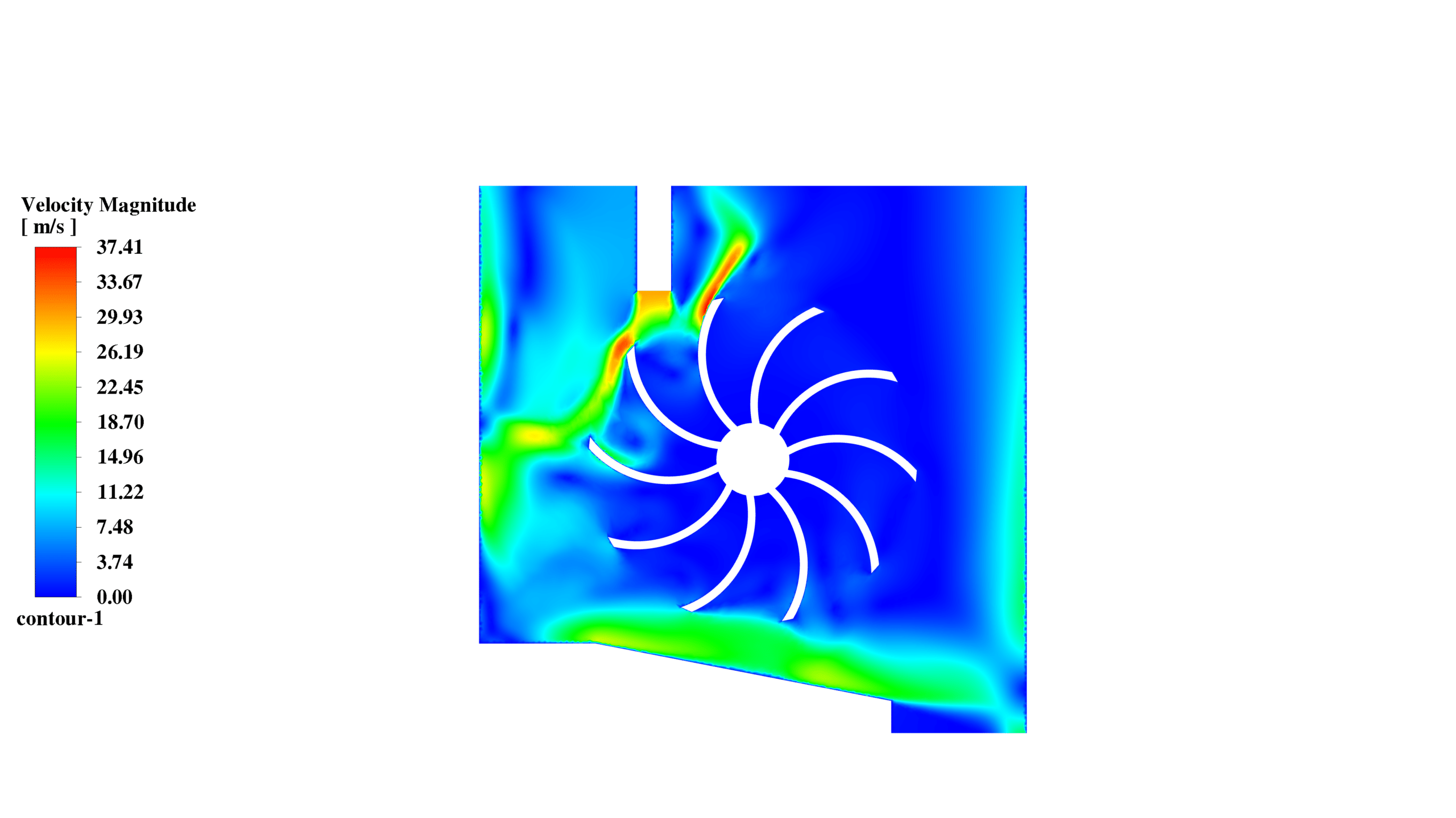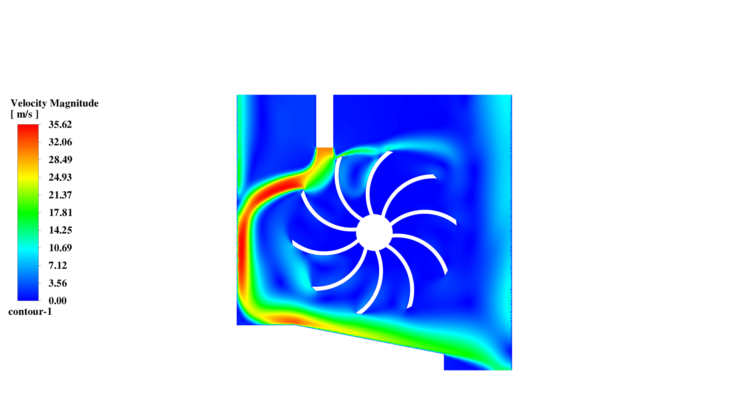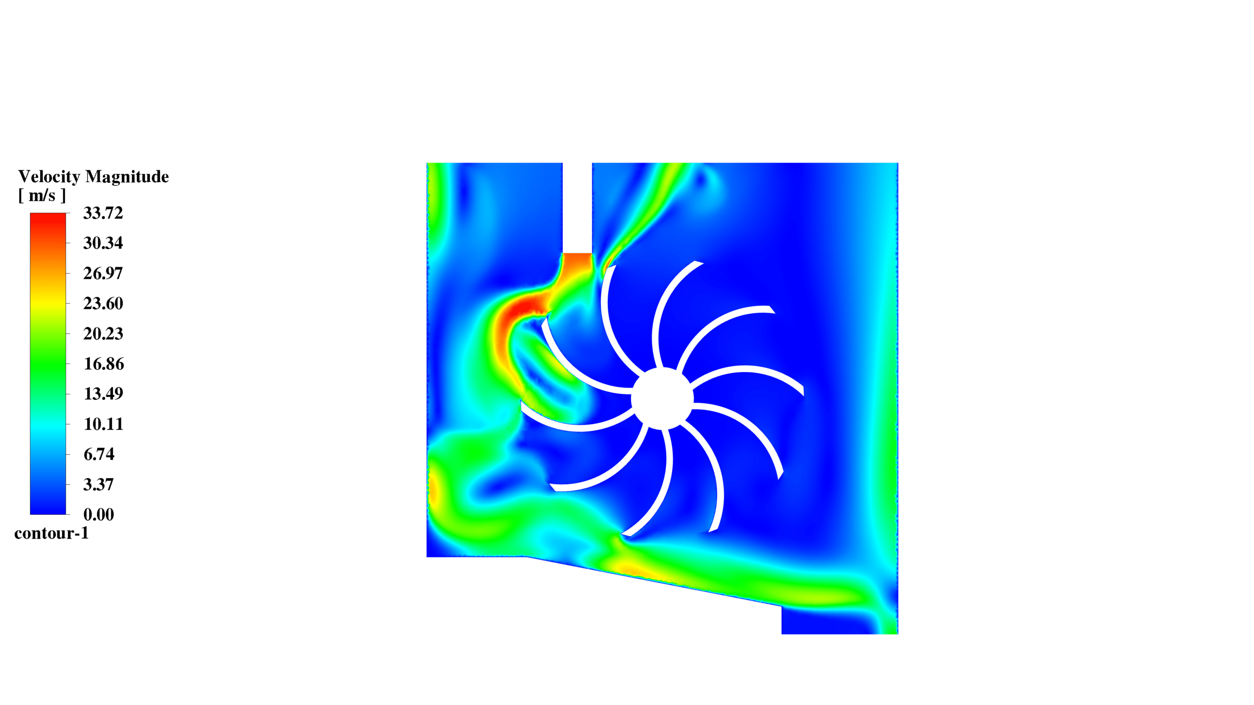 The airflow enters from the top inlet, interacts with the rotating wind turbine, and exits through the bottom-right outlet. The wind turbine’s rotation creates a swirling motion in the airflow, evident from the curved high-velocity regions in the contour plots. Areas of lower velocity are observed in the corners of the domain, indicating potential dead zones or recirculation regions.