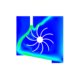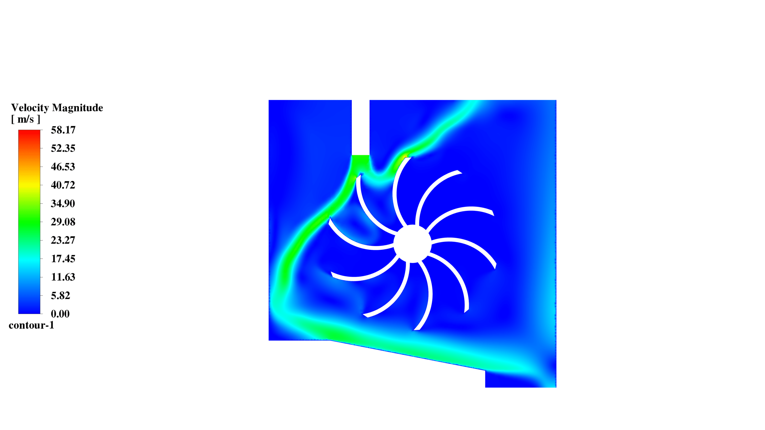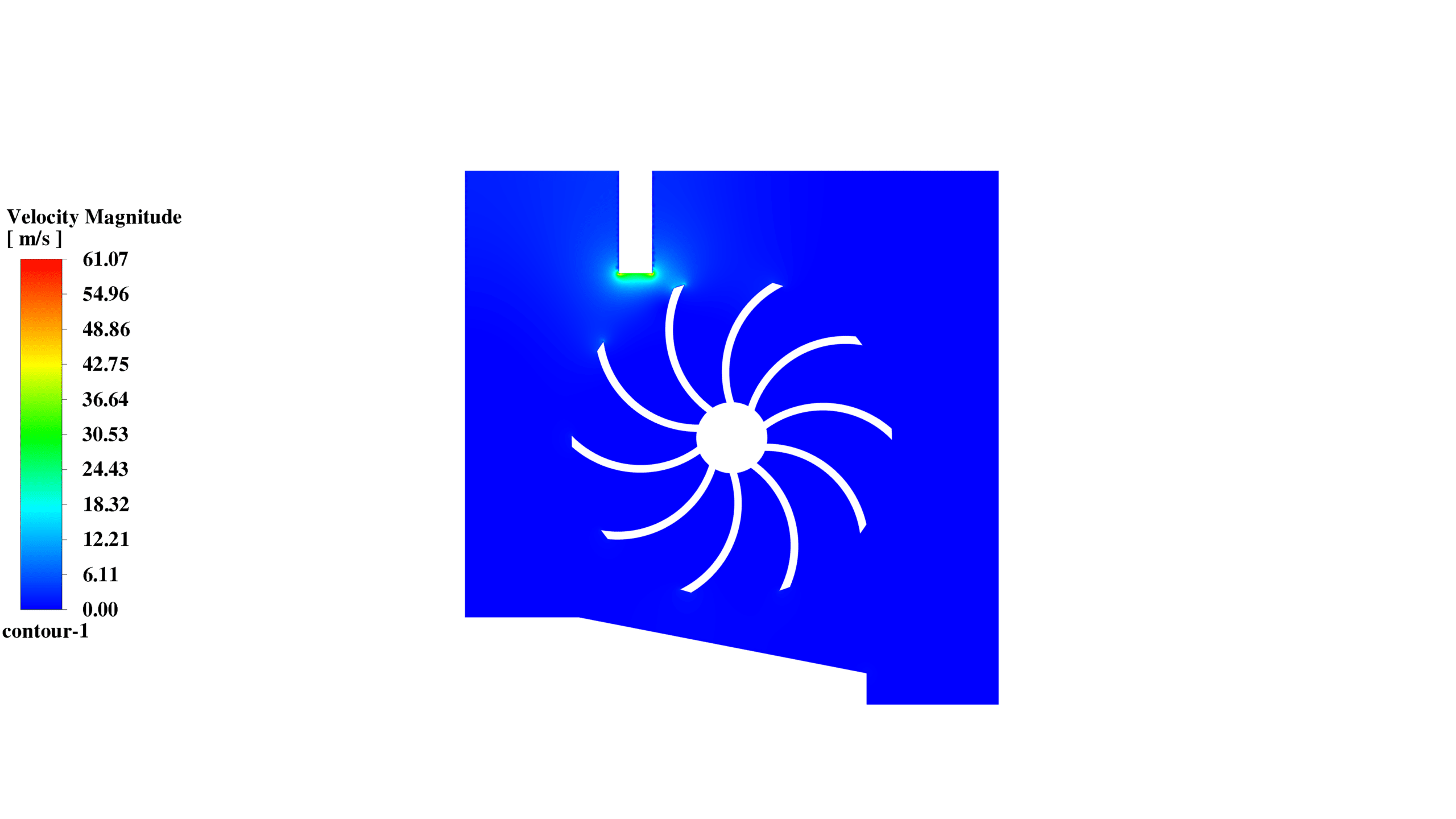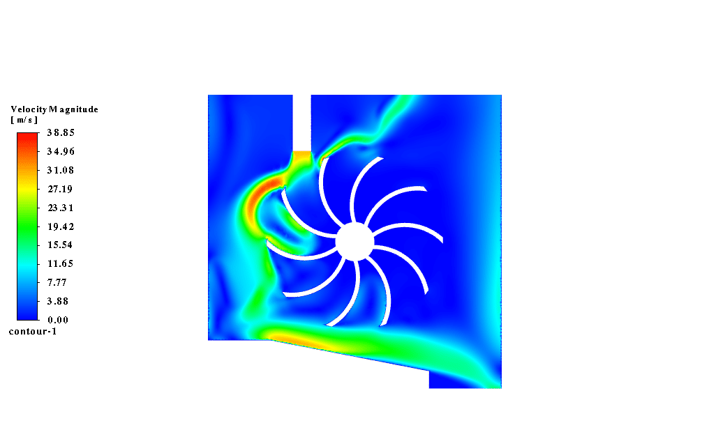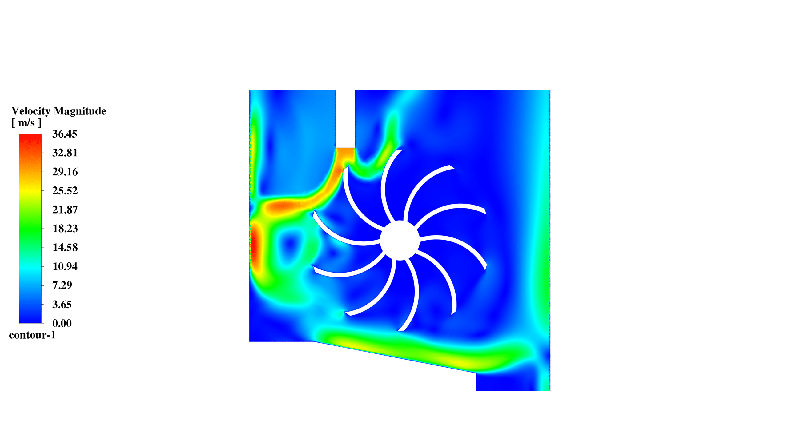 The airflow enters from the top inlet, interacts with the rotating wind turbine, and exits through the bottom-right outlet. The wind turbine’s rotation creates a swirling motion in the airflow, evident from the curved high-velocity regions in the contour plots. Areas of lower velocity are observed in the corners of the domain, indicating potential dead zones or recirculation regions.