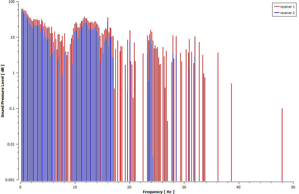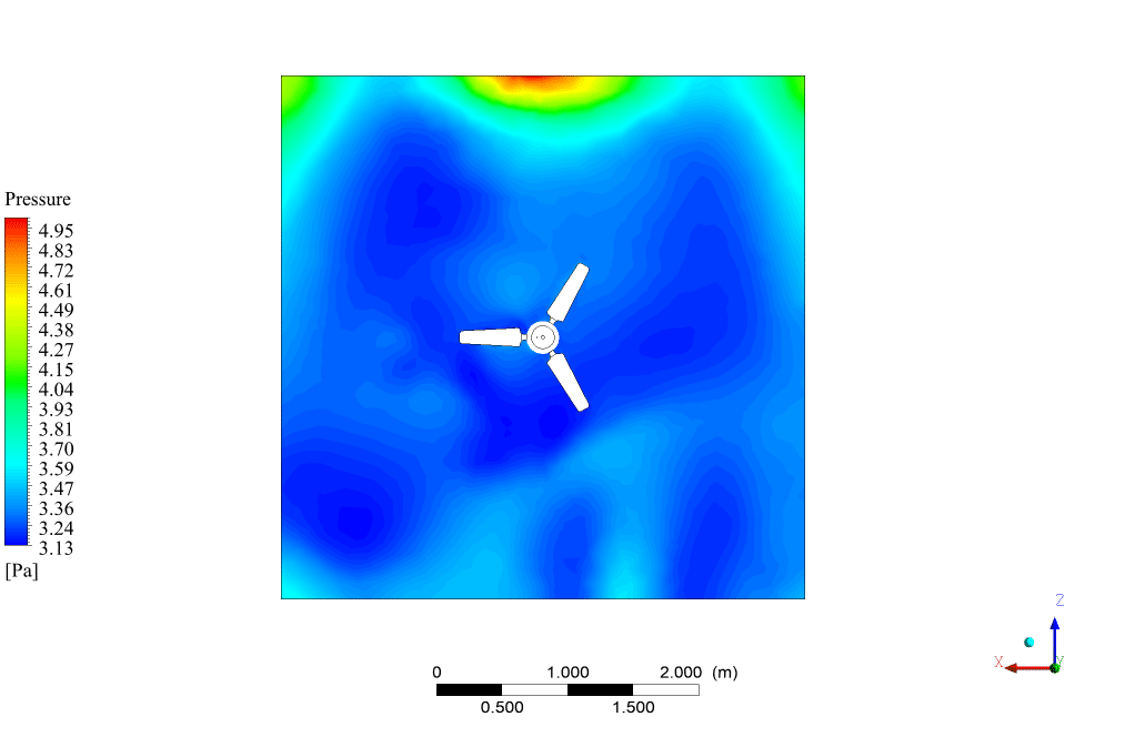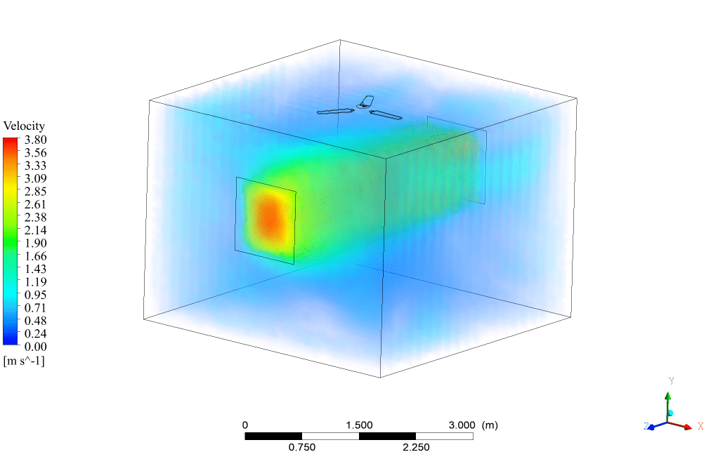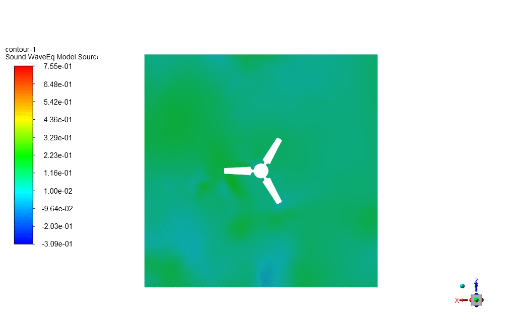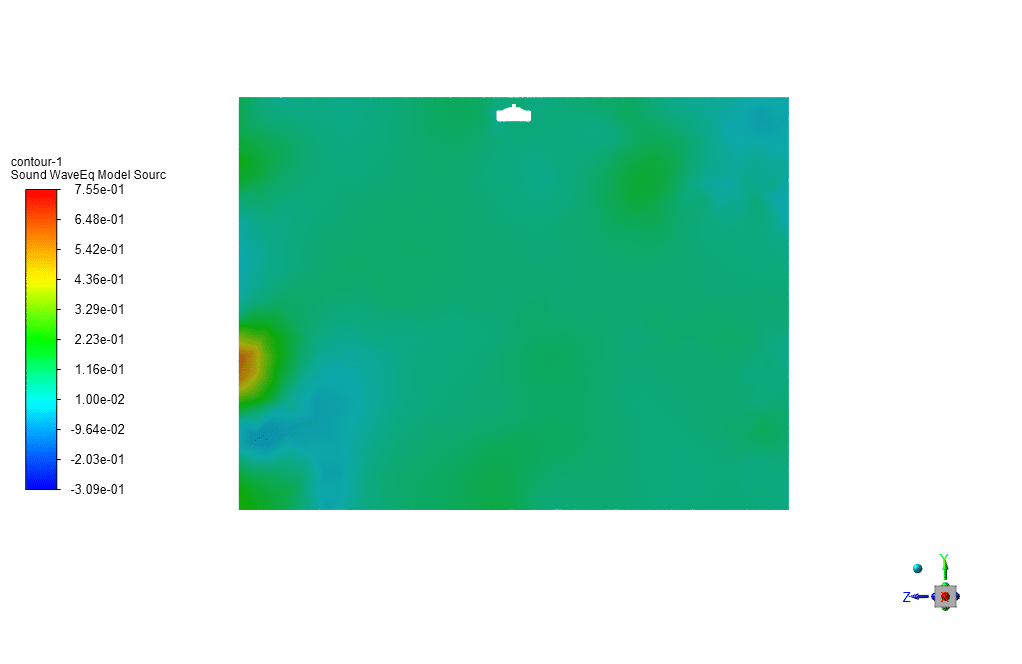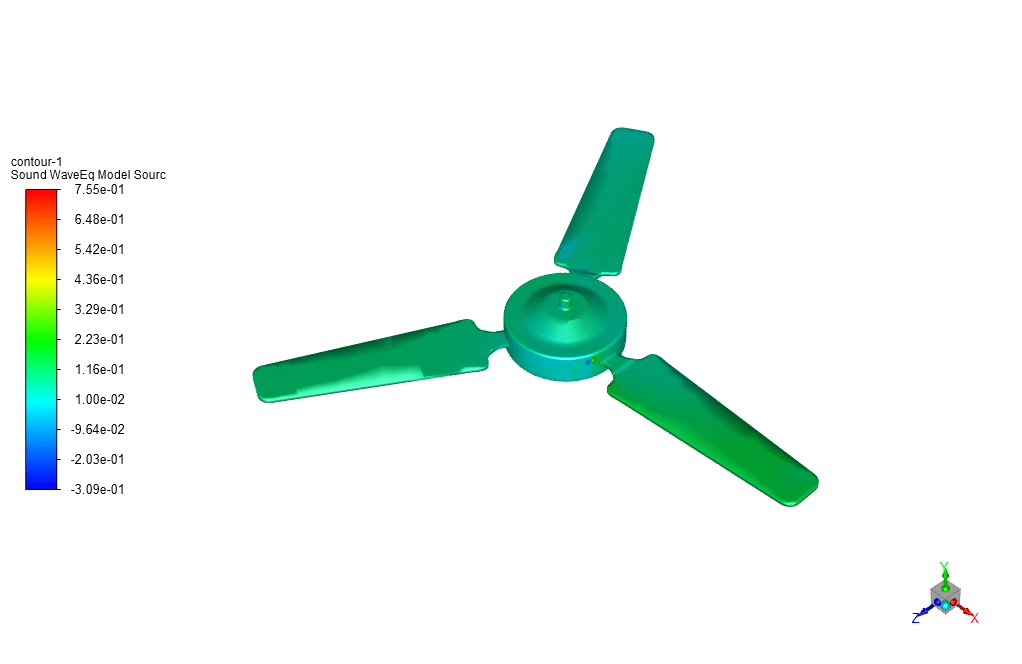 In this simuation, the wave equation method is used to predict the sound generated by the fan in a quiescent room. This method is a numerical approximation of the actual wave equation that predicts how sound pressure waves propagate in the environment. Unlike the FW-H method, which considers the aerodynamic sound emitted and propagated from the fan blades and is based on an integral method, the wave equation method looks specifically at sound generation due to the wind and the stationary fan. The wave equation accounts for the fan’s presence and shape as the wind interacts with it,-but the fan does not rotate in this method. The sound is predicted as a result of the wind’s interaction with static objects within the room.