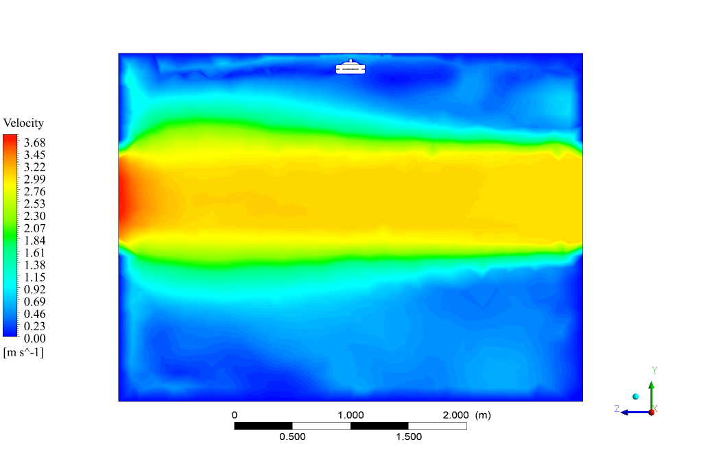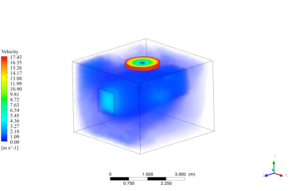 The present model is designed in three dimensions using the Design Modeler software. The geometry of the solution is a 3D square shape domain with 4, 3, and 4 m in X, Y, and Z directions, respectively. The ceiling fans center is located at the center of the room and has a 2.7m.