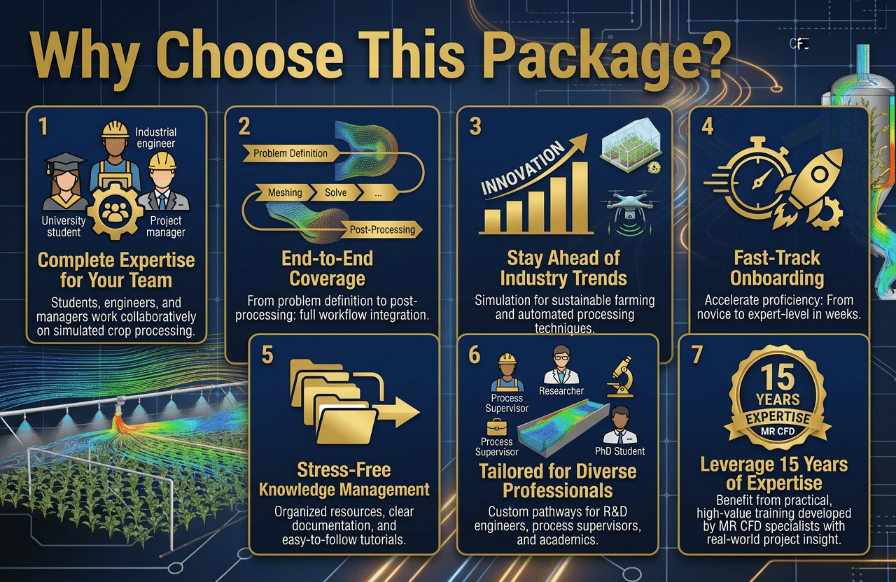 Complete Expertise for Your Team: Whether you have students, new employees, or an experienced team, our package ensures every individual becomes an expert in Agricultural & Food CFD simulation projects. No need for additional training, saving you valuable time and reducing stress.
