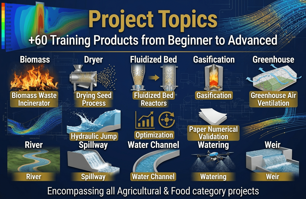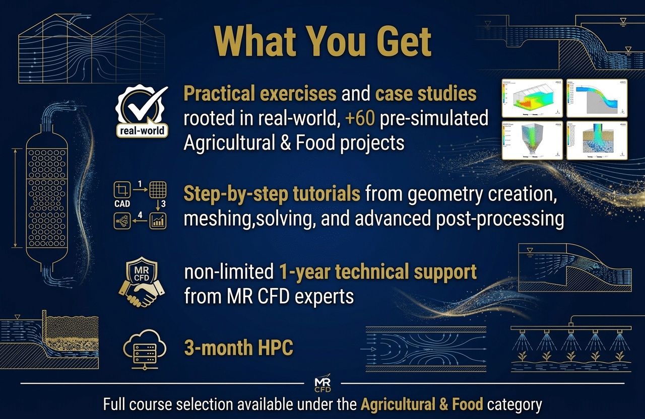 Empower your team with MR CFD’s comprehensive Agricultural & Food GOLDEN Training Package, featuring ANSYS Fluent CFD Simulation projects in real‑world applications such as biomass systems, dryers, fluidized beds, gasifiers, greenhouses, rivers, spillways, weirs, watering, and optimization. Perfect for professors, researchers, engineers, managers, and major companies, this package turns beginners into confident CFD users, accelerates onboarding, cuts training costs, and ensures your team can immediately tackle advanced Agricultural & Food engineering challenges with industry‑leading methods.