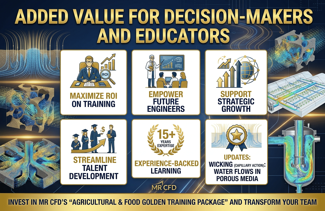 Packages receive regular enhancements for new project fields like Wicking (Capillary Action): Water flows in porous media, ensuring perpetual relevance without extra investment. Invest in MR CFD’s “Agricultural & Food Golden Training Package” and transform your team into Agricultural & Food engineering experts ready to meet today’s and tomorrow’s engineering and industry challenges. This turnkey solution empowers your organization to innovate faster, reduce risk, and secure a competitive edge with confidence.