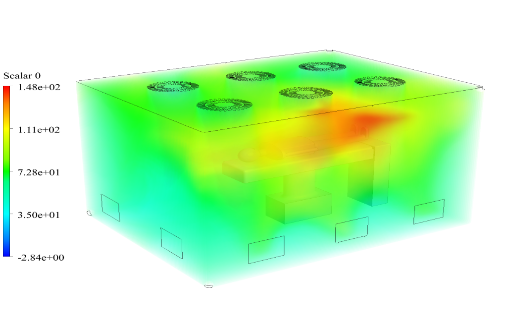 This simulation uses advanced CFD techniques to model the spread of the coronavirus in a patient’s room. It takes into account factors such as air flow, temperature, and humidity, which can all affect virus transmission.