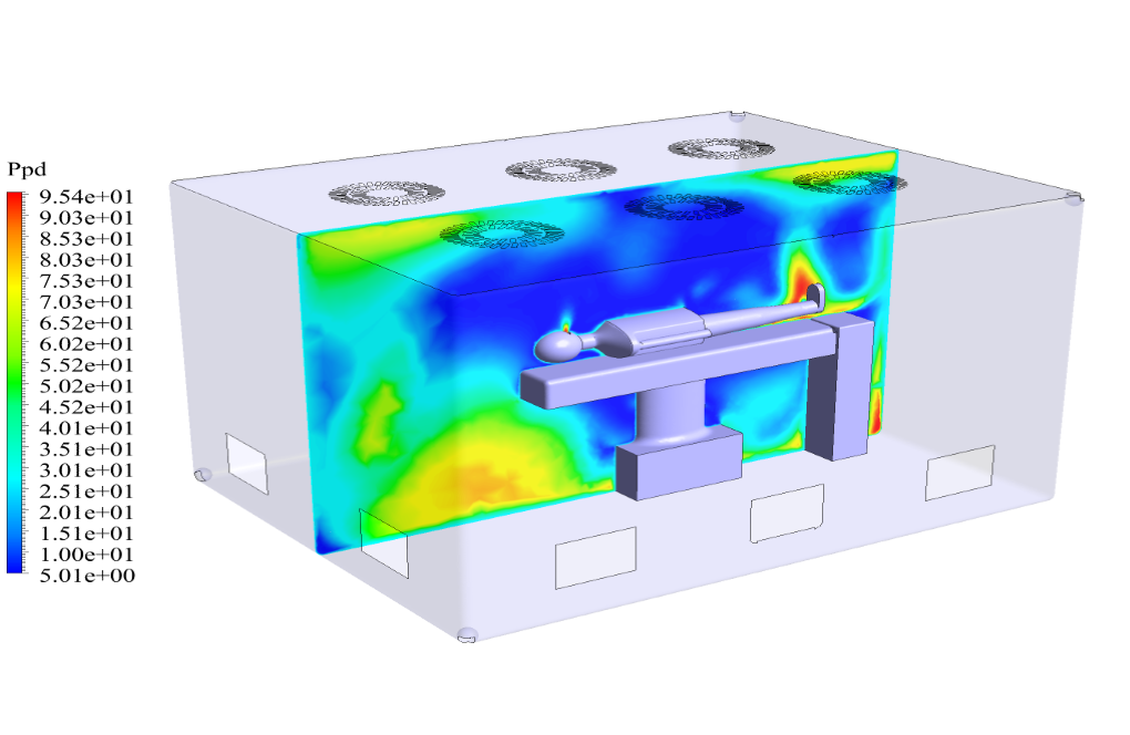 I am thoroughly satisfied with the simulation’s detailed representation of the clean room’s airflow and virus particle spread. The use of PMV and PPD to assess thermal comfort in this context adds great value to the analysis.