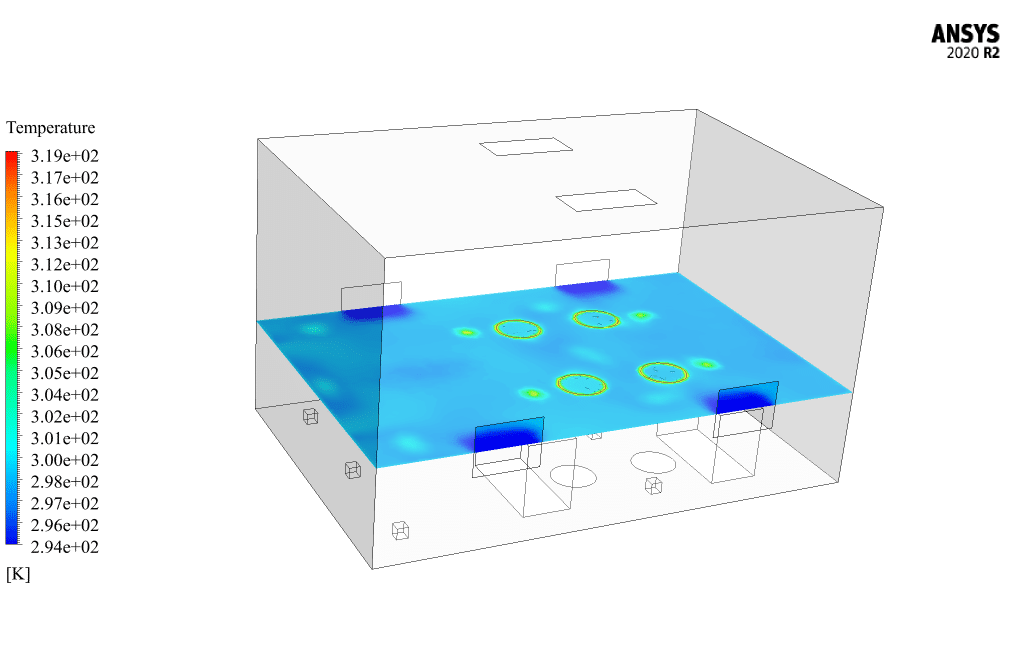 In addition, the room’s outer walls have a constant temperature of 26 ºC, and the surfaces of the tables are defined as insulation. Moreover, the RNG k-epsilon model and energy equation are enabled to solve the turbulent fluid equations and calculate temperature distribution.