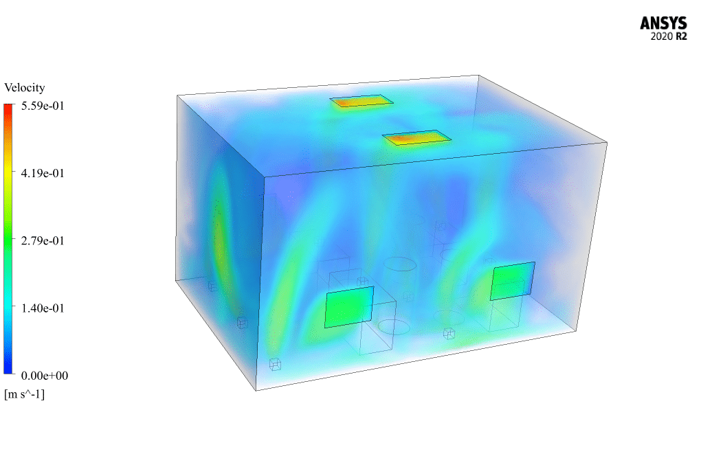 Inside the room, four people, four desks, four computers, and six heat sources are designed, Assuming that these items have a very simple geometric structure in the form of cylinders and cubes. Four entrance borders are defined on the room’s sidewalls, and two exit borders are defined on the ceiling of the room.