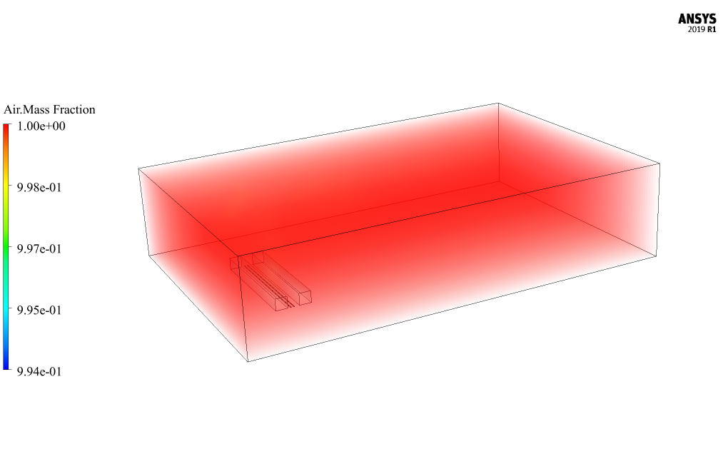 The model has two types of gas, including air and pollutants; the pollutant species has a specific heat capacity of 1100 j/kg.K and a molecular weight of 77.49064 kg/kmol, and air has a particular capacity of the heat of 1006.43 j/kg.K and the molecular weight is equal to 28.966 kg/kmol.