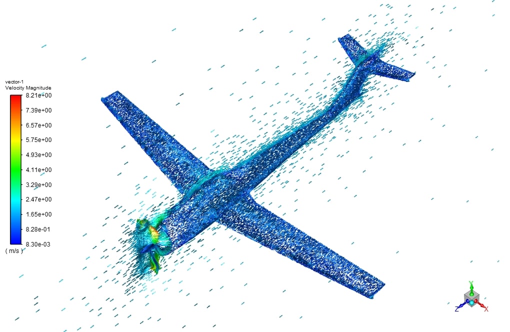 First, the geometry of the plane and the propeller in Solidworks software are designed and modeled to create the mesh, create the grid, and name the boundary conditions.