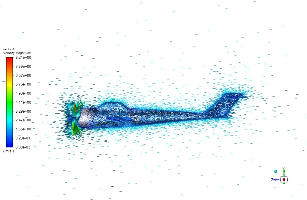 In the present work, simulations have been performed around the plane and the propeller, and the values of drag and lift force on the fuselage and thrust and torque on the impeller have been obtained.