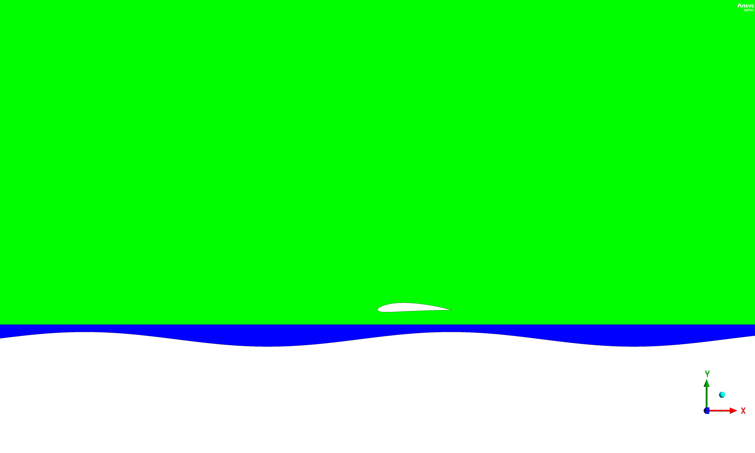 The 2D geometry was created in ANSYS DesignModeler and composed of a rectangular computational domain containing an airfoil positioned slightly above a sinusoidal bottom boundary, which represents a wavy ground surface. The domain was divided into two zones: a stationary zone and a moving zone that contains the airfoil. This moving zone allows the airfoil and surrounding fluid to move uniformly at a constant velocity, simulating a relative motion condition.