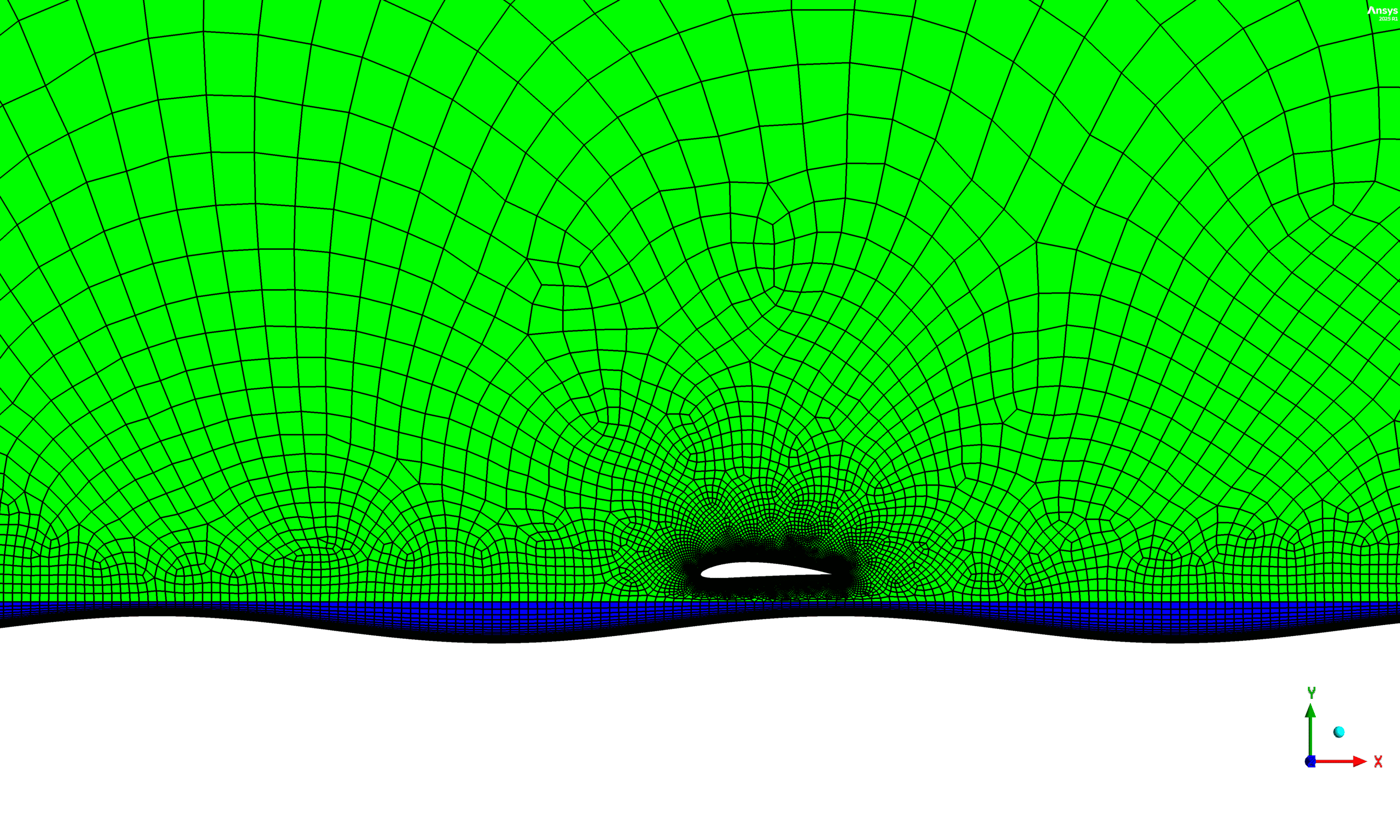 - The 2D model includes an airfoil over a wavy bottom surface, divided into stationary and moving zones, with a structured refined mesh near the airfoil and wall.