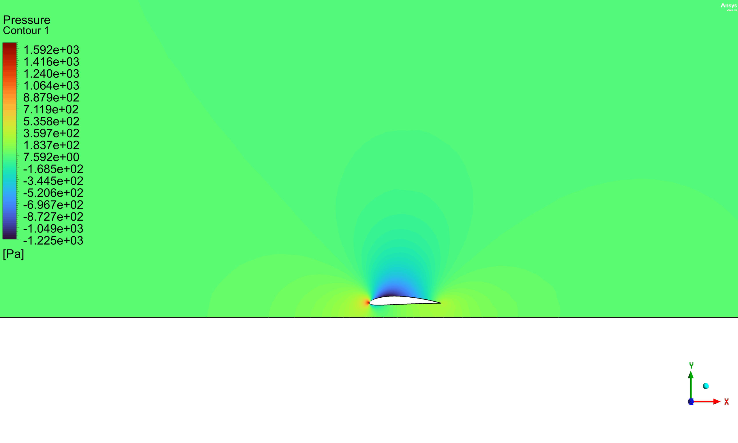 The simulation was performed in ANSYS Fluent using a pressure-based transient solver suitable for incompressible flow conditions. Gravity was activated to account for body force effects, though its impact on the flow around the airfoil was minimal due to the dominance of dynamic pressure. The k–ω SST turbulence model was adopted because of its robustness and ability to accurately predict boundary layer separation and near-wall effects.