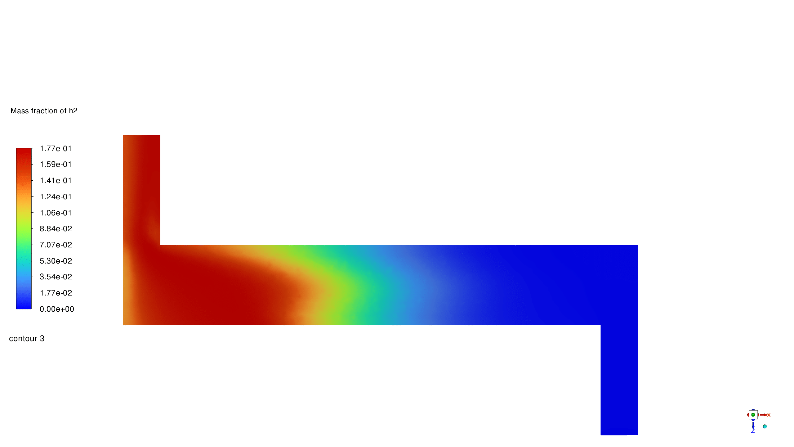 - H2 mass fraction contour increases along the flow direction, reaching maximum concentration (0.177) near the outlet, confirming successful NH3 decomposition.