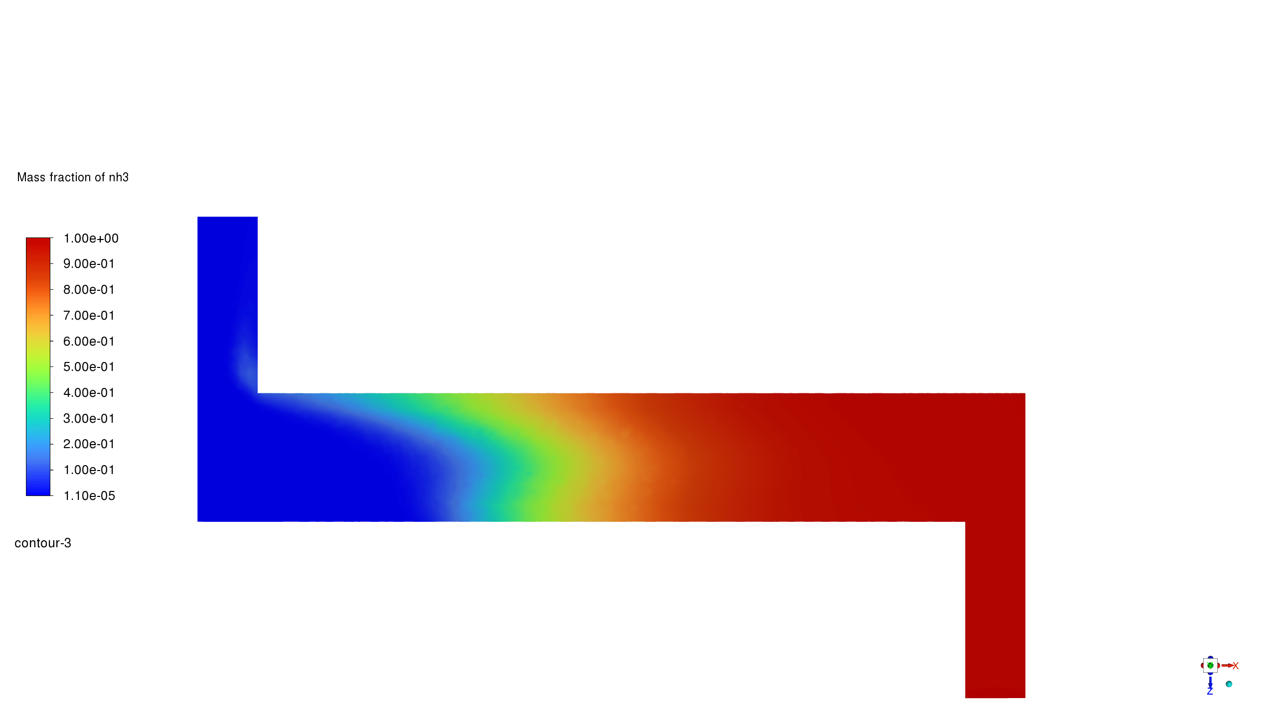 - NH3 mass fraction contour indicates progressive decomposition from inlet to outlet, demonstrating effective thermal decomposition.