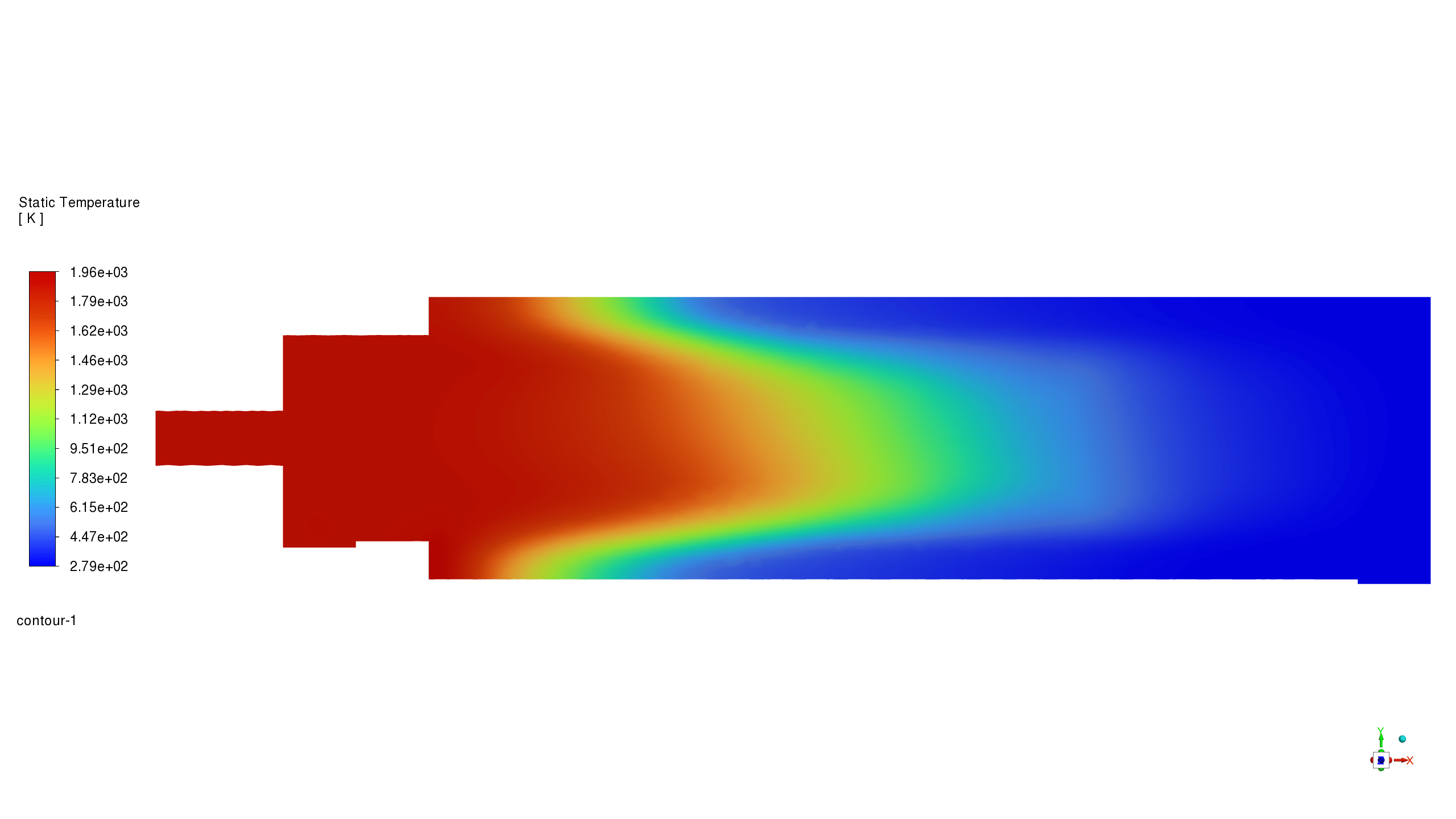 - Propane (C3H8) mass fraction shows highest concentration at inlet with gradual consumption along the combustion chamber.