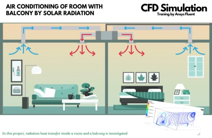 As the last practical exercise, we consider radiation, as one of the expertise products of this CFD training package. In exercise number 10, heat transfer inside a room and a balcony is investigated by ANSYS Fluent software. The balcony has a glass roof and one glass wall. Due to the radiation of sunlight, both room and balcony become warmer and natural convection plays an important role in circulating the flow inside these spaces.