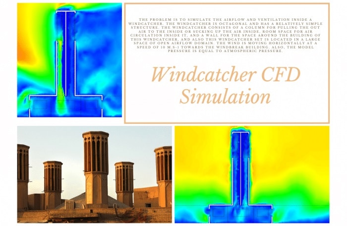 Then, in the 8th project, we simulate the airflow and ventilation inside a windcatcher. The windcatcher is octagonal and has a relatively simple structure. The windcatcher consists of a column for pulling the out air to the inside or sucking up the air inside, room space for air circulation inside it, and a wall for the space around the building of this windcatcher, and also this windcatcher set is located in a large space of open airflow domain.