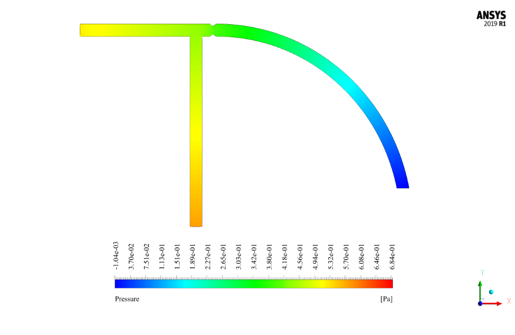 The pressure contour shows that the pressure of the fluid decreases after passing through the stenosis and its value is less than the pressure at the inlet of the two branches.