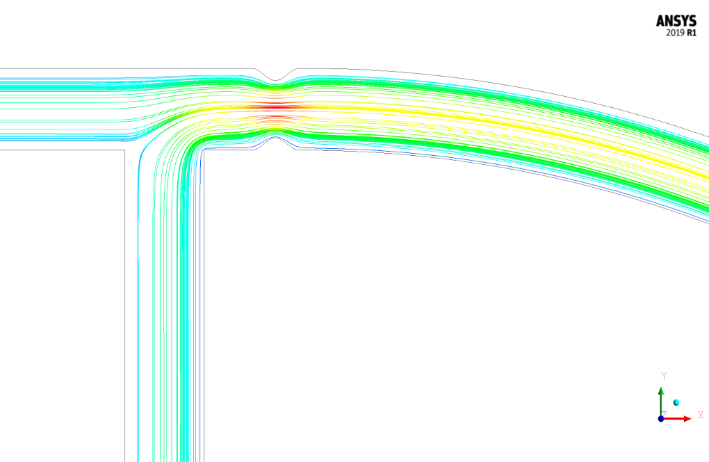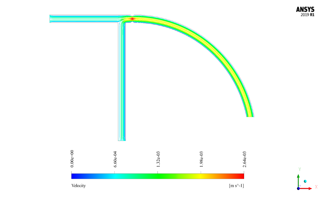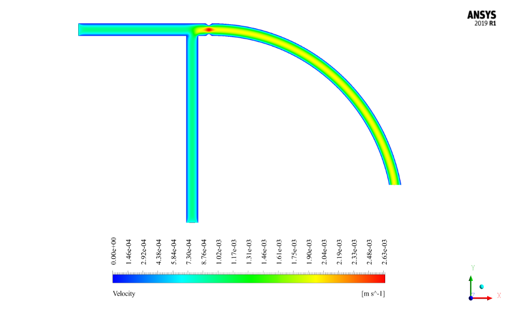 After simulation, 2D contours of pressure and velocity, as well as 2D pathlines and vectors, are obtained. The velocity contour indicates that the maximum velocity value occurs exactly at the stenosis point; Because the cross-section of the fluid reaches a minimum.