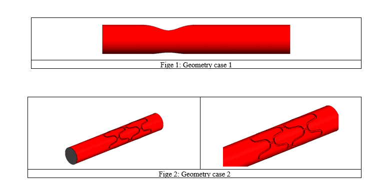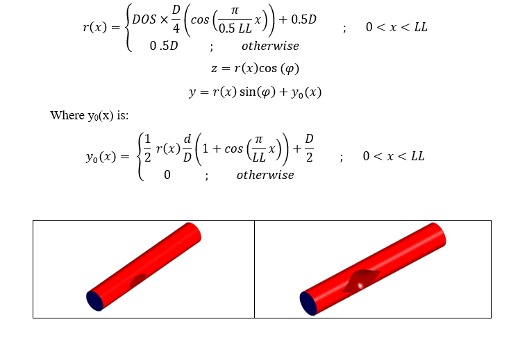 1.Geometry Creation: Two geometries were modeled using SpaceClaim software. The first case represented a Stenosis artery without a stent, while the second case incorporated an artery with a stent implanted. The following equation has been utilized to create the clogged area(Case 1).