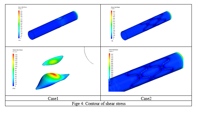 - Shear Stress Distribution: The simulations revealed a significant difference in shear stress distribution between the two cases. In the Stenosis artery without a stent, high shear stress regions were observed, which can potentially lead to endothelial cell damage and increased risk of thrombosis. However, with the introduction of the stent in the second case, the shear stress levels were substantially reduced, indicating improved hemodynamics and reduced risk of complications.