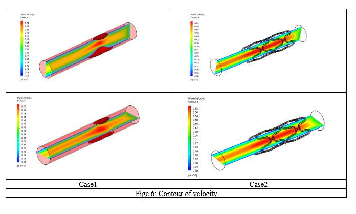 - Pressure Distribution: The pressure distribution also varied between the cases. In the Stenosis artery without a stent, higher pressure was observed compared to the stented artery case. This finding aligns with the expected behavior, as stents help alleviate the narrowing of the artery and facilitate improved blood flow, thereby reducing the pressure burden.