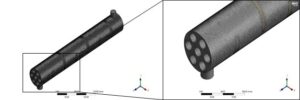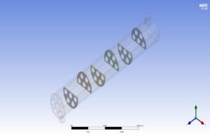 The geometry was designed using the Design modeler module (figure below), and its geometric specifications include a shell with 600 mm distance and 90 mm in diameter, six baffles with a thickness of 4 mm, the center-to-center distance of the baffles was 86 mm, and the value of baffle cut was 36%. Also, seven tubes with an outer diameter of 20 mm with a triangular arrangement and a center-to-center distance were 30 mm inside the shell.