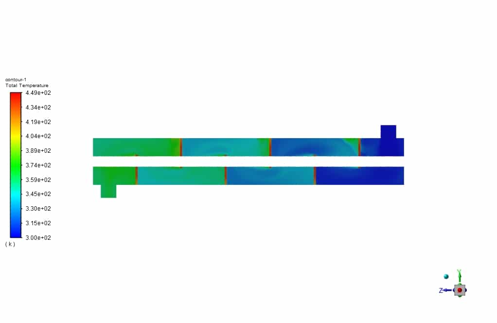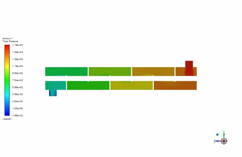 In addition, the total pressure contour at a plain in the middle of the heat exchanger shows that the amount of pressure drop is in the range of 1 kPa for this exchanger.