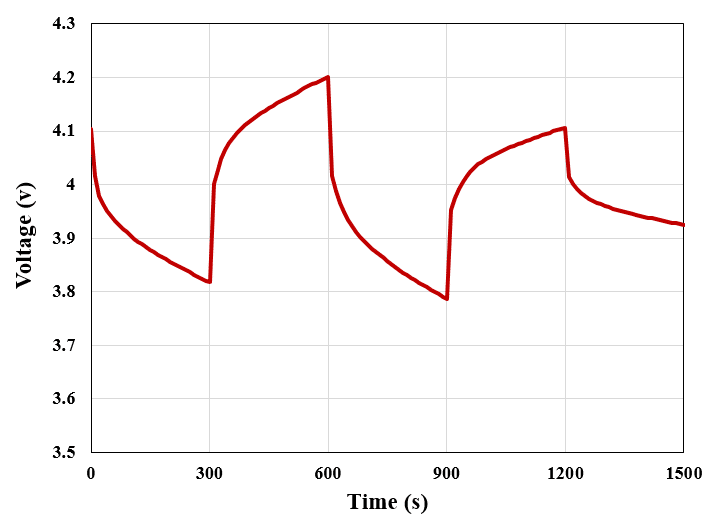 According to our defined profile, the battery discharged by a 20 A current in the first 300 s, charged by a 1 C-rate in the next 300 s, discharged by an 80 W power in the next 300 s, charged by a 10 A current in the next 300 s and finally discharged by a 0.5 C-rate in the last 300 s.