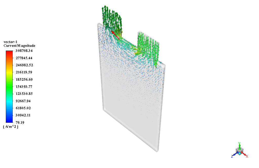 Finally, we obtained the vector of the current magnitude inside the battery’s active cell. These vectors confirm that the current leaves the positive tab and enters the negative tab.