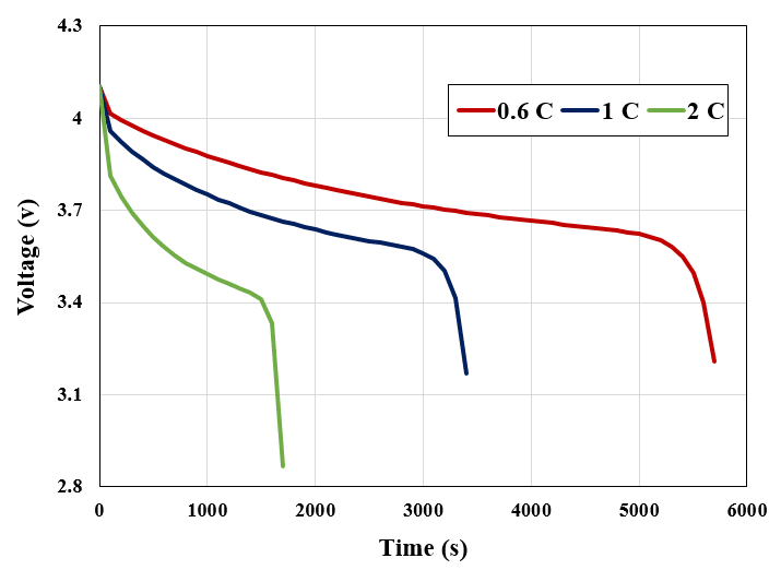 We aim to analyze the battery discharge process at different C-rates. The C-rate is defined as the charging/discharging current to the battery’s nominal capacity. So, we simulated the battery in different cases, including 0.6C, 1C, and 2C.