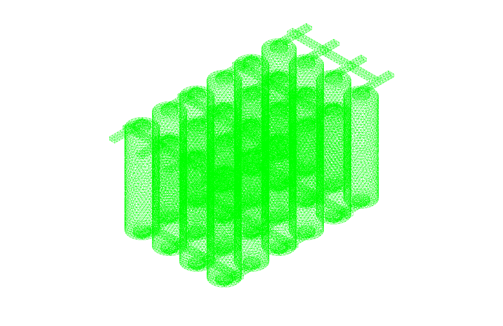 First, we modeled the battery pack geometry in Design Modeler software. Each cylindrical battery consists of a cell zone with positive and negative tab zones. In this battery pack, the terminals of each battery are connected by busbars.