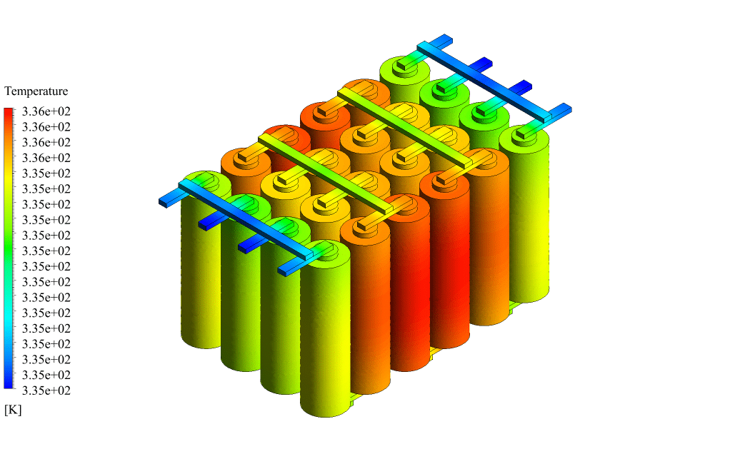 Finally, we simulated this battery pack using the Battery model in ANSYS Fluent software.
