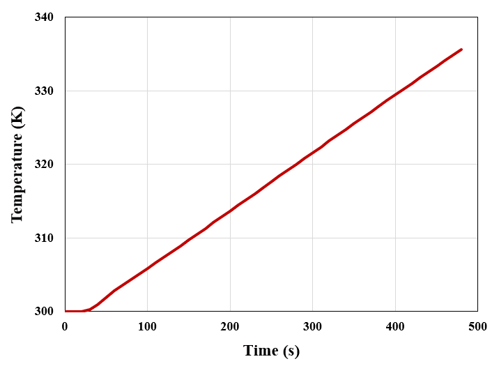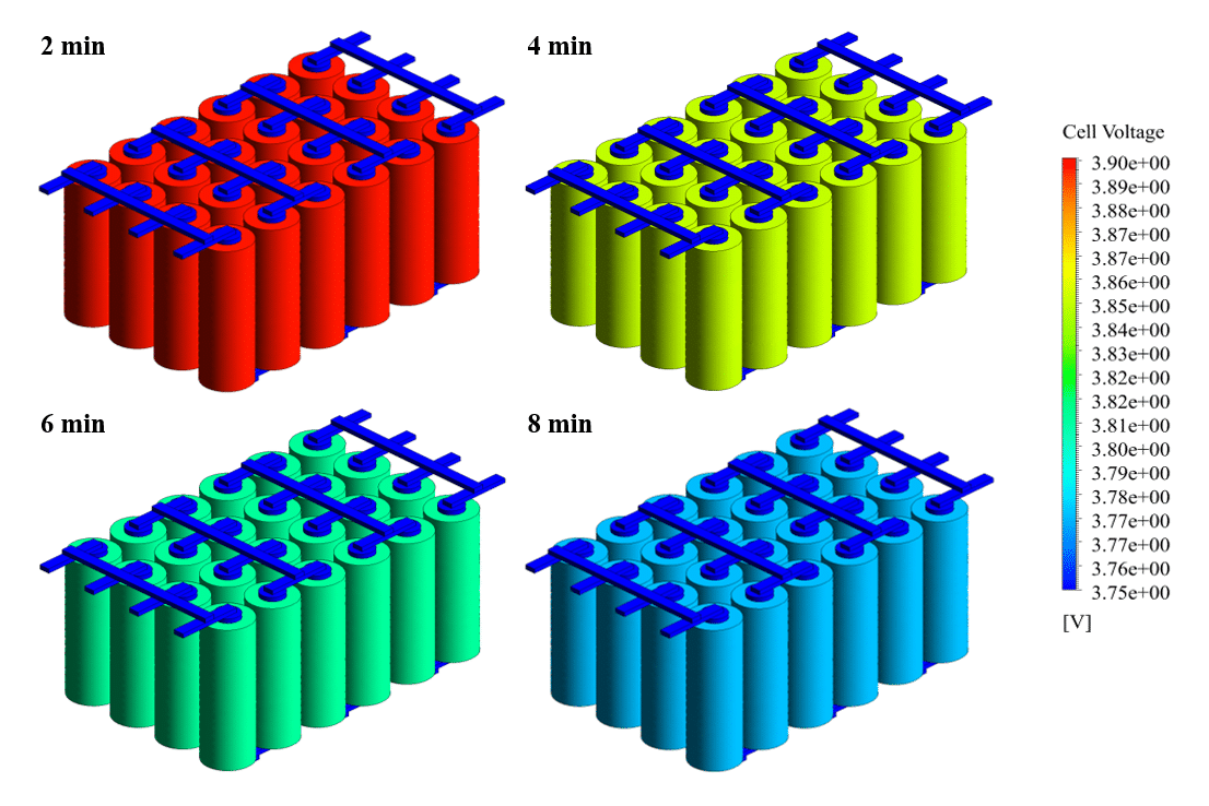 Then, we obtained the contours of temperature, cell voltage, and SOC (state of charge) at different times. These contours confirm the plots of potential and temperature.
