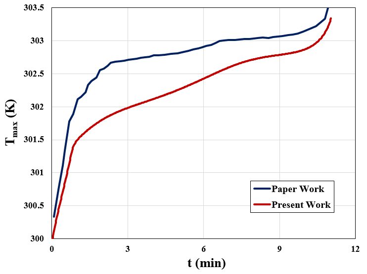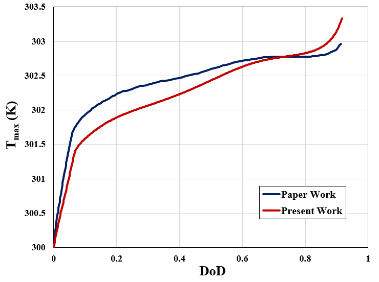 Finally, we compare the present results with the paper to reach paper validation. Therefore, we present the maximum temperature over time and the maximum temperature with respect to DoD (depth of discharge).