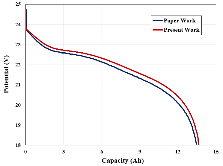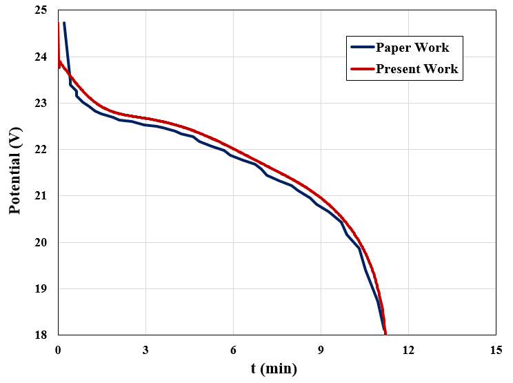 Finally, we compare the present results with the paper to achieve paper validation. Therefore, we present the battery pack voltage over time and the battery pack voltage with respect to capacity.