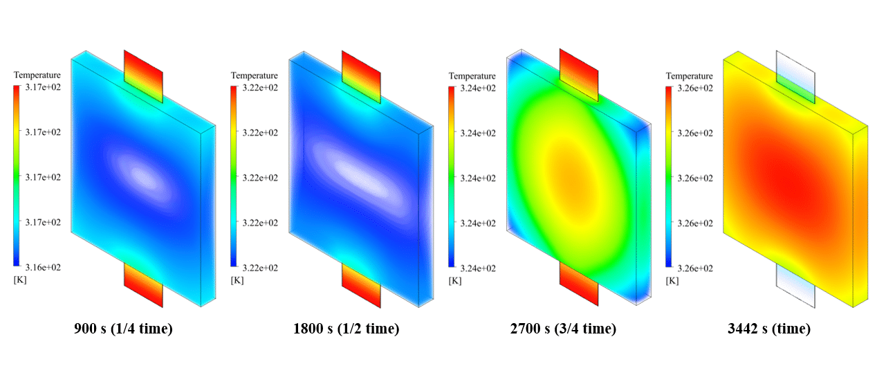 In case 2, we investigate a battery with PCM. According to the results, battery temperature increases at a slow rate. In other words, the PCM absorbs the heat generated in the battery cell, which leads to control temperature rise.