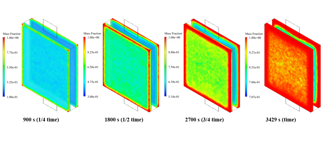 So, we obtain contours of liquid fraction distribution at different times. According to the results, PCMs change from solid to liquid phase by absorbing heat from the battery cell.
