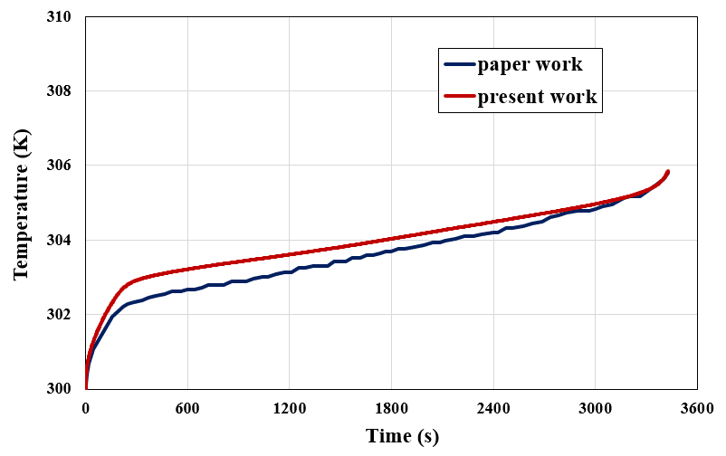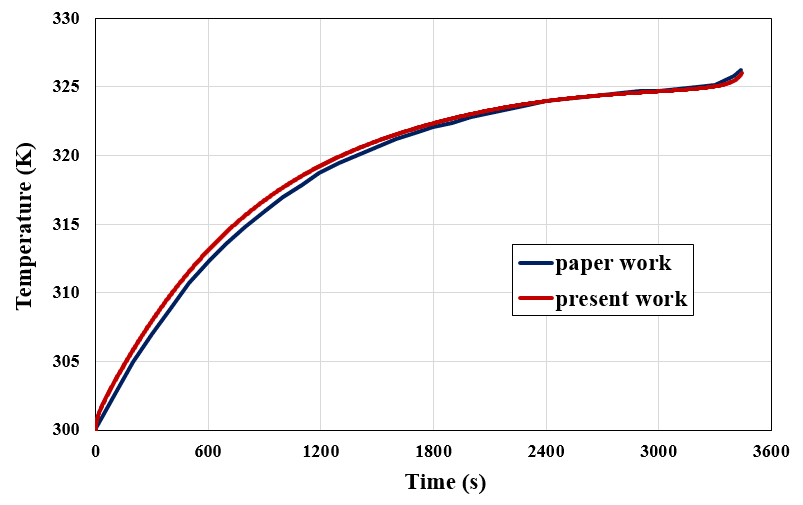 We present this CFD product based on the simulation of a reference article “Thermal management of counter terminal lithium-ion battery using Bio-based PCM.” Then, we compare the present work results with the reference article to obtain a paper validation.