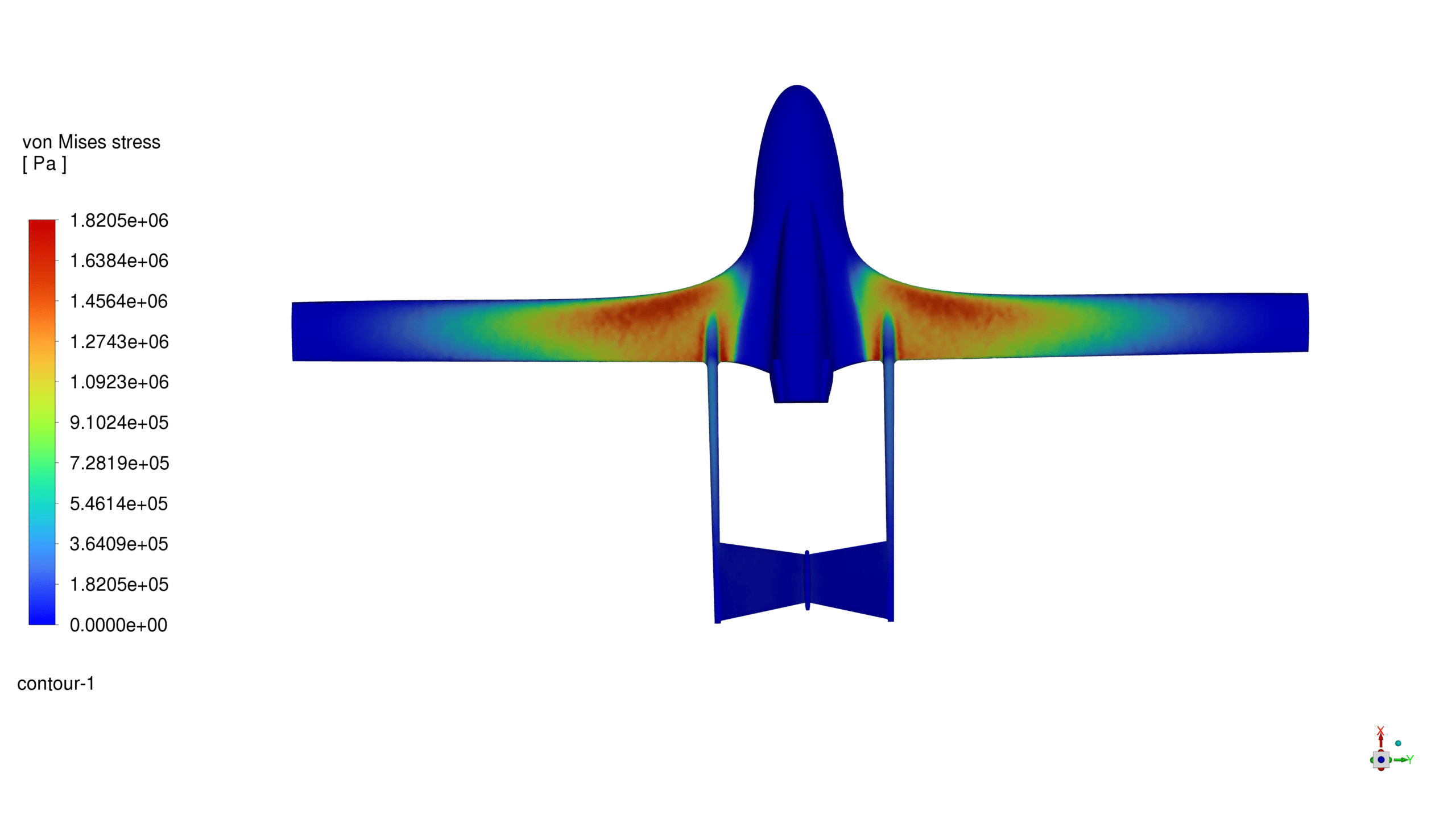 According to the extracted contours, it is observed that, as expected, the greatest displacement occurs at the wing tips of the UAV and the greatest stress is at the wing-body connection.