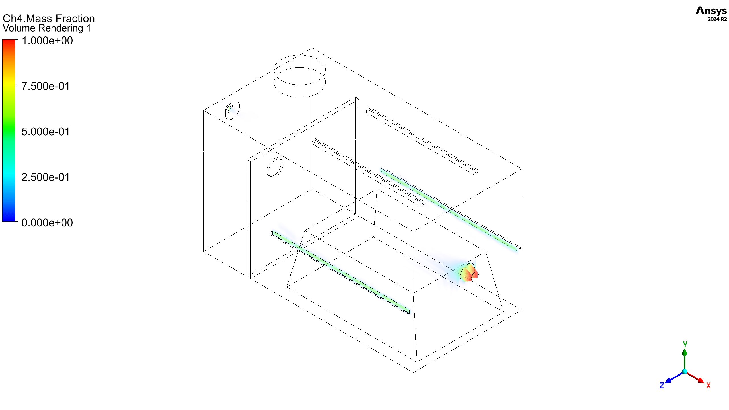 To represent the continuous generation of combustible gases from the waste, fixed source terms for CO and H2 mass fractions were applied at the rubbish surface boundary condition.