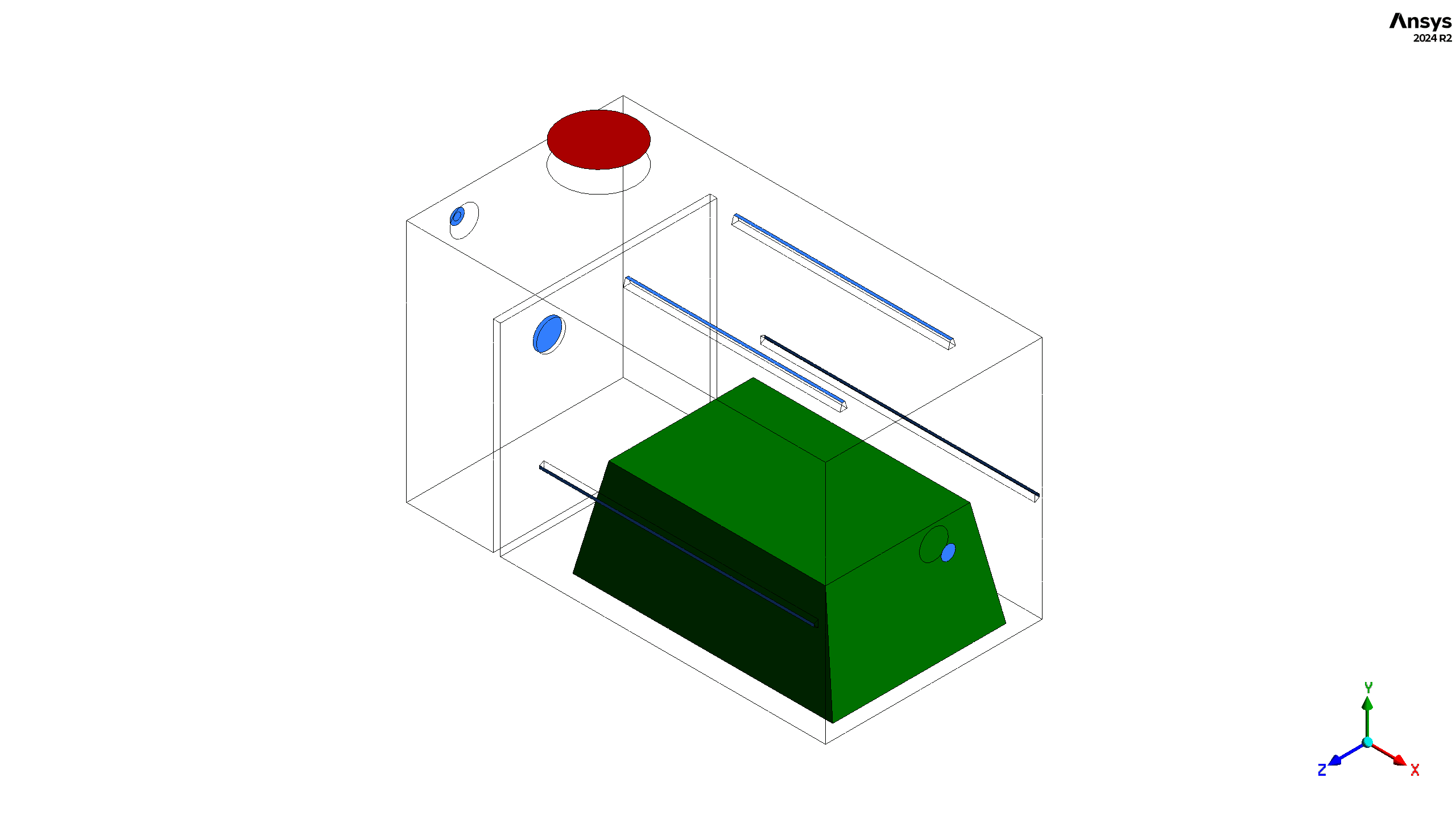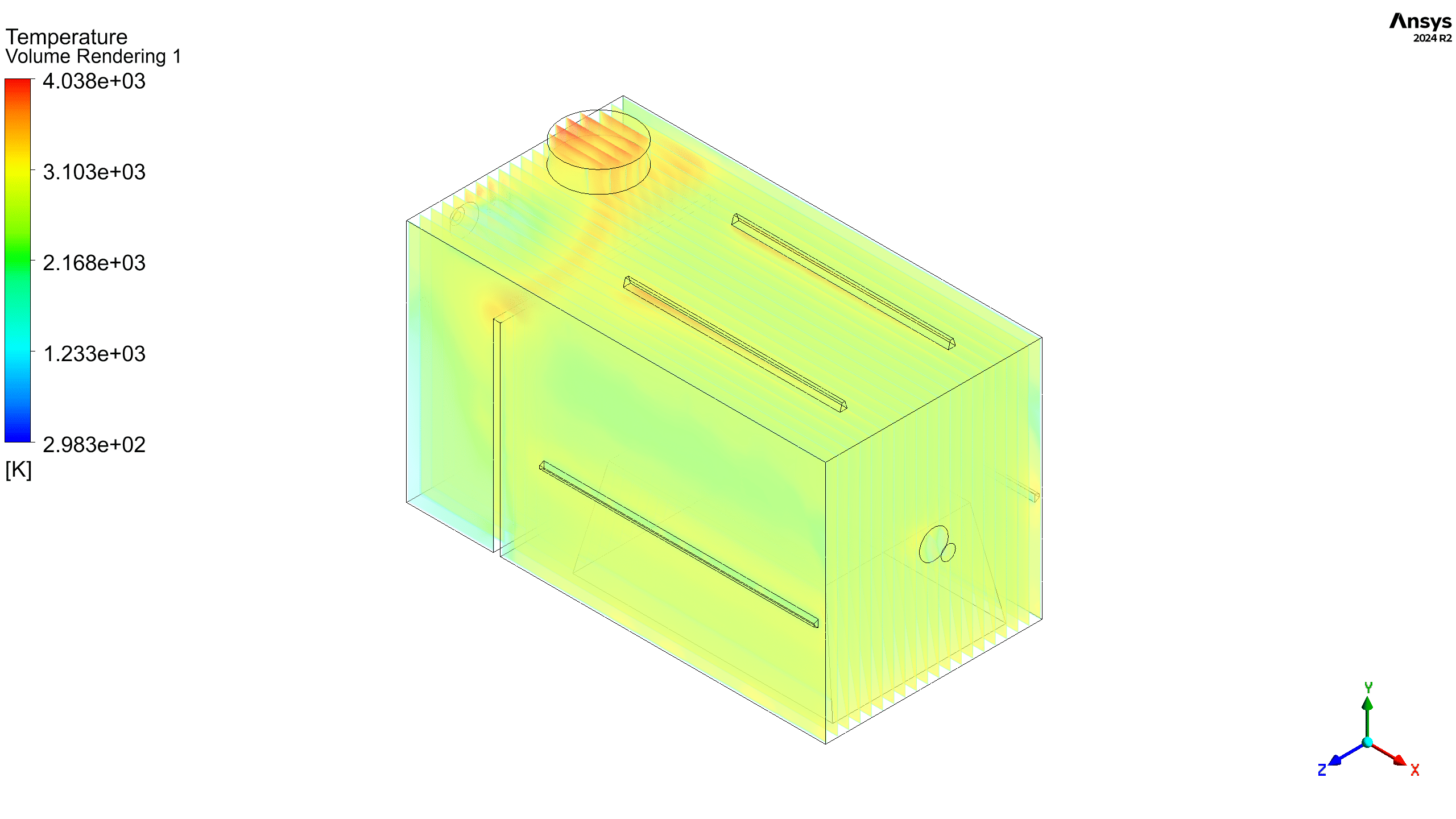 The CFD simulations were conducted using ANSYS Fluent software. The geometry designed in ANSYS Design Modeler represents an industrial incinerator with multiple air and fuel inlets and two exhaust gas outlets. The computational domain includes a trapezoidal waste pile, air inlets, fuel inlets, and a cooling system. Then the geometry is meshed using ANSYS Meshing software, while the total number of elements are 513233.