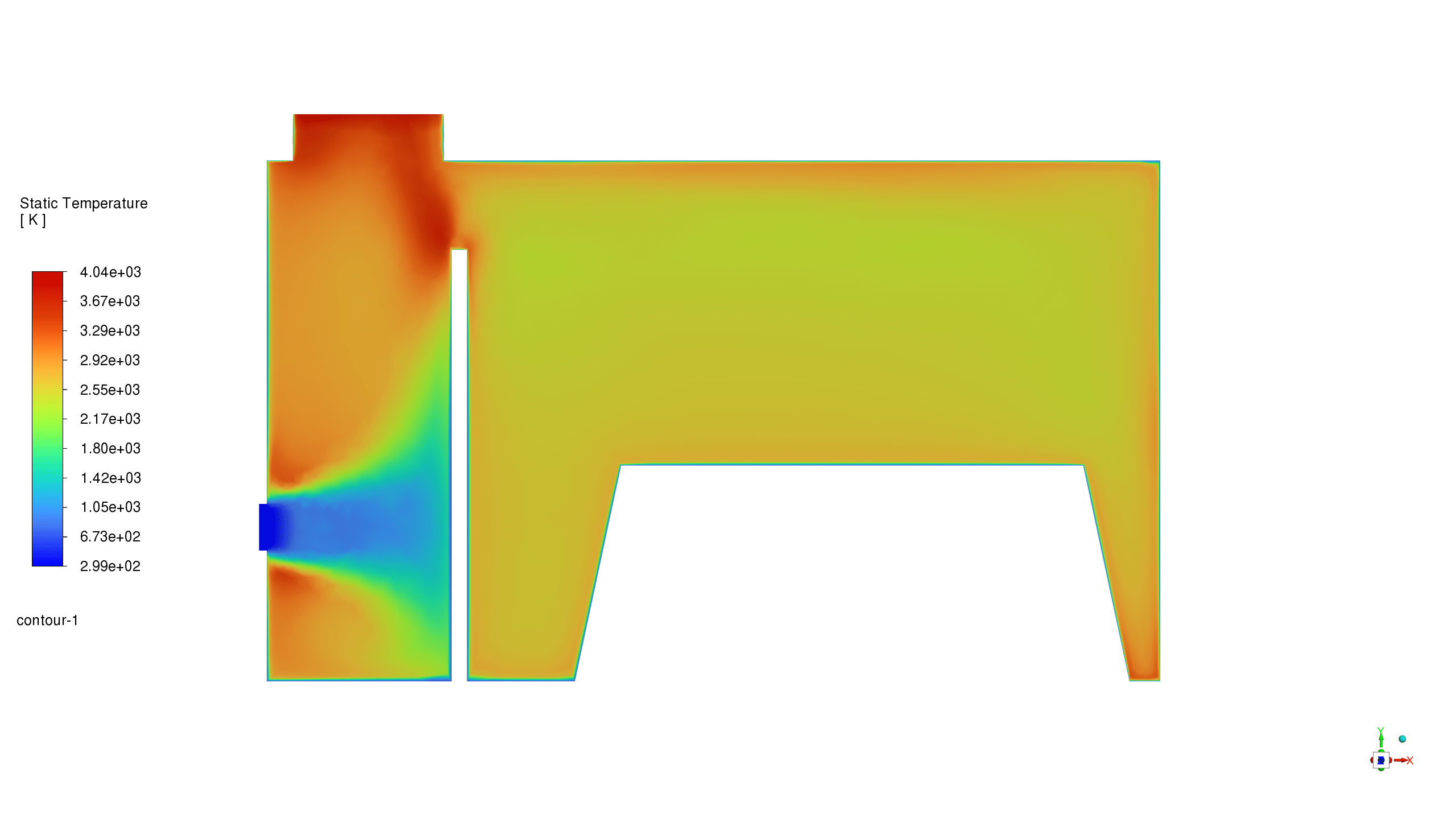 The simulation results show a significant temperature gradient within the incinerator. The outlet chamber temperature (4042.636 K) is considerably higher than the inlet temperature (300 K), indicating effective heat generation and transfer in the main combustion zone. The average temperature inside the incinerator zone is equal to 2619.4 K.