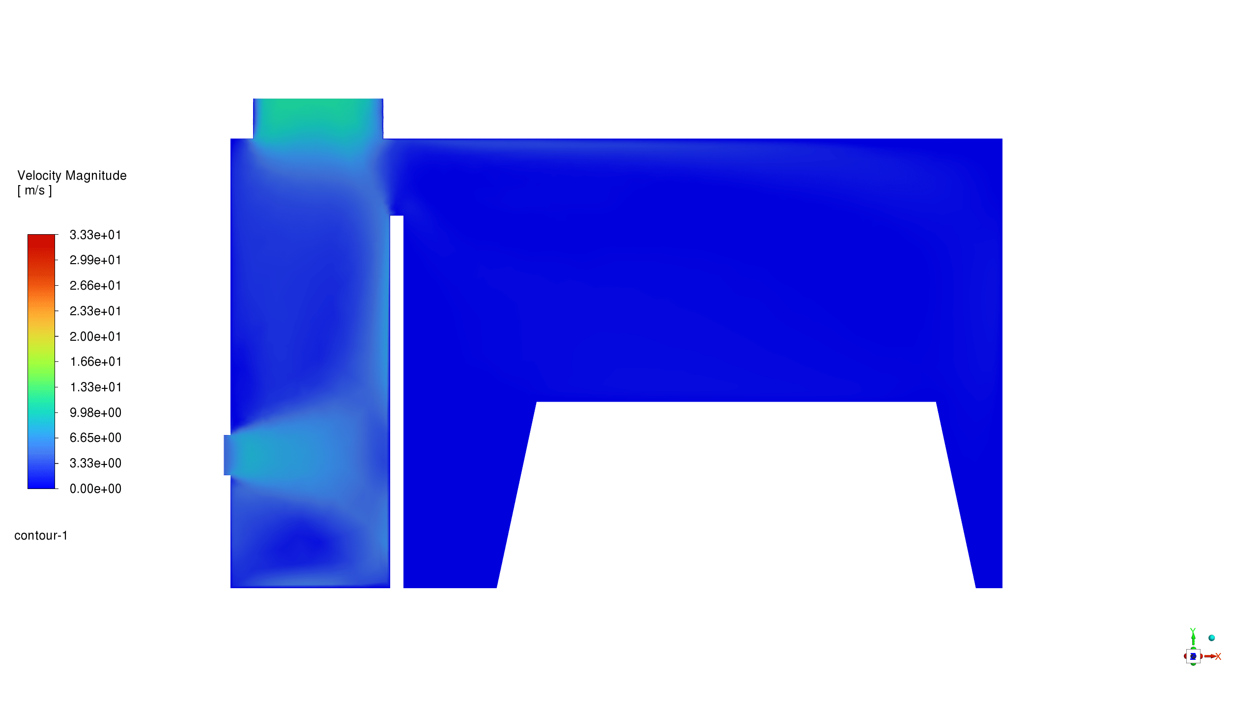 The velocity magnitude contours reveal complex flow patterns within the incinerator, with maximum velocities reaching 33.25 m/s. These flow patterns play a crucial role in mixing air and fuel, as well as distributing heat throughout the chamber.