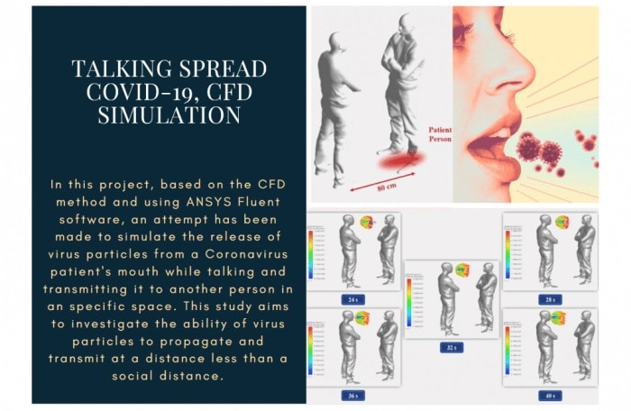 In the practical Exercise number 6, based on the CFD method and using ANSYS Fluent software, an attempt has been made to simulate the release of virus particles from a Coronavirus patient’s mouth while talking and transmitting it to another person in a specific space (social distancing). This study aims to investigate the ability of virus particles to propagate and transmit at a distance less than a social distance. For the present simulation, the discrete phase model (DPM) is used; Because this model allows us to study a mass of particles discretely in a continuously fluid space.