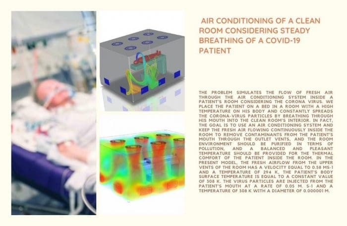 Simulation number 8 simulates the flow of fresh air through the air conditioning system inside a patient’s room considering the CORONA virus by ANSYS Fluent software. We place the patient on a bed in a room with a high temperature on his body and constantly spreads the CORONA-virus particles by breathing through his mouth into the room’s interior. In fact, the goal is to use an air conditioning system and keep the fresh air flowing continuously inside the room to remove contaminants from the patient’s mouth through the outlet vents, and the room environment should be purified in terms of pollution, and a balanced and pleasant temperature should be provided for the thermal comfort of the patient inside the cleanroom.
