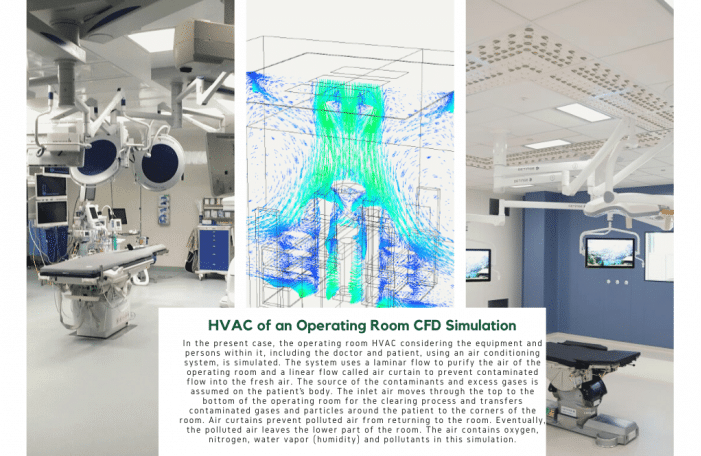 In case number 1, the operating room HVAC, using an air conditioning system, is simulated considering the equipment and persons within it, including the doctor and patient. The system uses a laminar flow to purify the air of the operating room and a linear flow called an air curtain to prevent contaminated flow into the fresh air. The source of the contaminants and excess gases is assumed on the patient’s body.