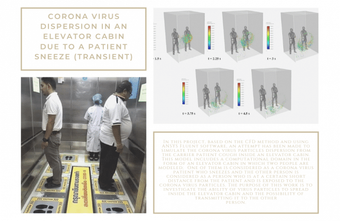 In project number 6, based on the CFD method, an attempt has been made to simulate the coronavirus particles dispersion from the carrier patient sneeze inside an elevator cabin. This model includes a computational domain in the form of an elevator cabin in which two humans are modeled; One of them is considered a coronavirus patient who coughs or sneezes and the other person is considered a person who is at a certain distance from the patient and is exposed to the coronavirus particles (Social Distance). In project number 7, based on the CFD method, an attempt has been made to simulate the release of virus particles from the mouth of a corona carrier patient inside a car. The purpose of this study is to investigate the diffusion power of virus particles inside the car interior. For the present simulation, the discrete phase model (DPM) is used.